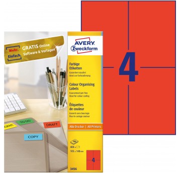 Etykiety trwałe kolorowe Avery Zweckform, A4, 100 ark./op., 105 x 148 mm, czerwone