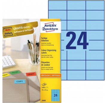 Etykiety trwałe kolorowe Avery Zweckform, A4, 100 ark./op., 70 x 37 mm, niebieskie
