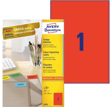 Etykiety trwałe kolorowe Avery Zweckform, A4, 100 ark./op., 210 x 297 mm, czerwone