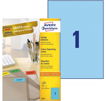 Etykiety trwałe kolorowe Avery Zweckform, A4, 100 ark./op., 210 x 297 mm, niebieskie