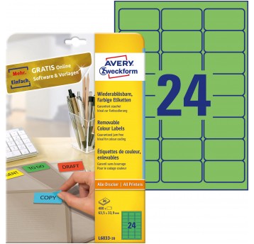 Etykiety usuwalne kolorowe Avery Zweckform, A4, 20 ark./op., 38,1 x 21,2 mm, zielone