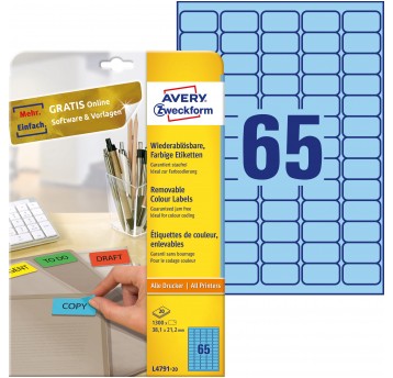 Etykiety usuwalne kolorowe Avery Zweckform, A4, 20 ark./op., 38,1 x 21,2 mm, niebieskie