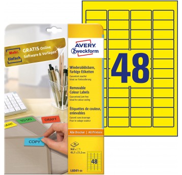Etykiety usuwalne kolorowe Avery Zweckform, A4, 20 ark./op., 45,7 x 21,2 mm, żółte