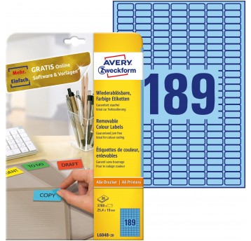 Etykiety usuwalne kolorowe Avery Zweckform, A4, 20 ark./op., 25,4 x 10 mm, niebieskie