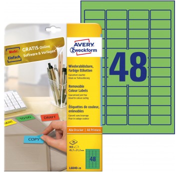 Etykiety usuwalne kolorowe Avery Zweckform, A4, 20 ark./op., 45,7 x 21,2 mm, zielone