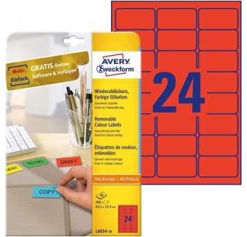 Etykiety usuwalne kolorowe Avery Zweckform, A4, 20 ark./op., 63,5 x 33,9 mm, czerwone