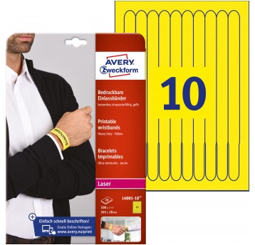 Opaski identyfikacyjne na nadgarstki do zadruku Avery Zweckform, A4, 10 ark./op., 265 x 18 mm, folia poliestrowa, żółte