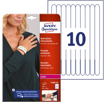 Opaski identyfikacyjne na nadgarstki do zadruku Avery Zweckform, A4, 10 ark./op., 265 x 18 mm, folia poliestrowa, białe