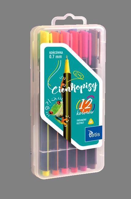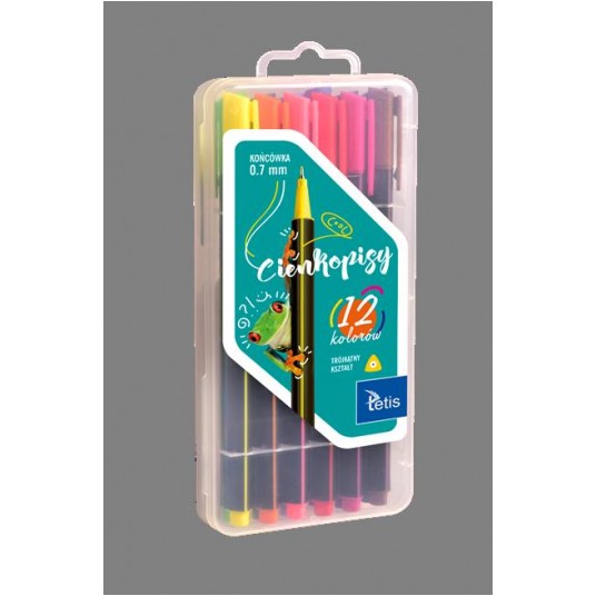 - cienkopisy trójkątne - posiada wentylowaną skuwkę oraz odporną na złamanie końcówkę - fibrowa końcówka o grubości 0,7 mm zapewnia precyzyjną linię pisania o grubości 0,4 - 0,5 mm - opakowanie: pudełko 12 kolorów