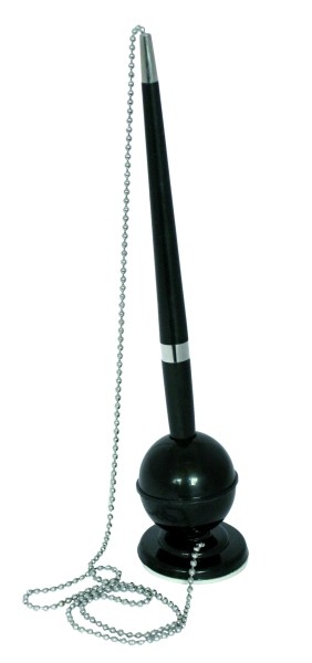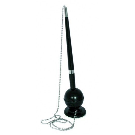 - wygodny w użyciu, połączony metalowym łańcuszkiem z samoprzylepną podstawką w kształcie kulki, utrzymującą długopis w pozycji pionowej - podstawka ma możliwość obrotu - produkt posiada certyfikat jakości ISO