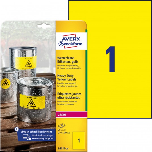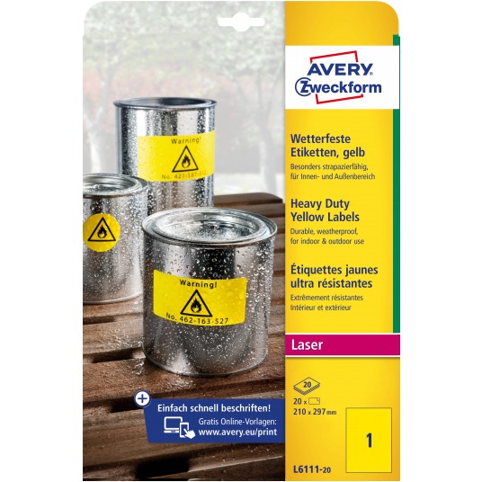 • Niezwykle wytrzymałe etykiety samoprzylepne wykonane z żółtego poliestru.