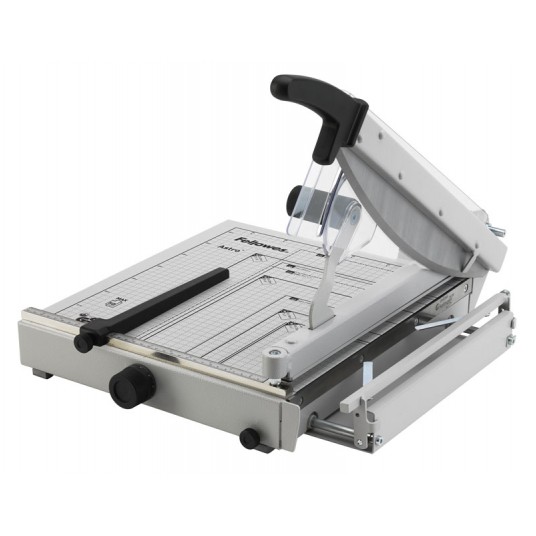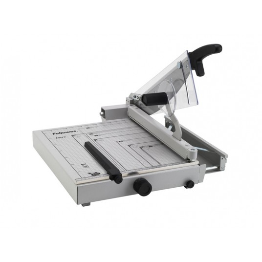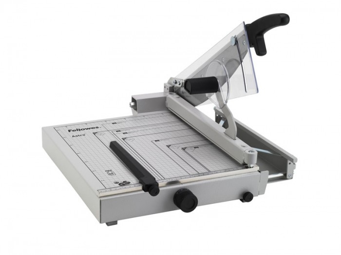 Fellowes Astro A4 o profesjonalna gilotyna przeznaczona do regularnego użytku w punkcie usługowym. Umożliwia jednorazowe cięcie do 50 arkuszy (80 g/m2) do rozmiaru A4, w tym zdjęć, kartonu, plastikowych okładek do bindowania i cienkich płyt piankowych. Wyposażona w wytrzymałe ostrze ze stali Solingen oraz ruchomy ogranicznik boczny i tylny, które pozwalają precyzyjnie ułożyć papier i wyznaczyć miejsce cięcia (dokładna krawędź cięcia może być również wyznaczona za pomocą ogranicznika przedniego). Dzięki swojej wadze (9,60 kg) urządzenie jest stabilne podczas pracy, a ręczny docisk papieru z dużym uchwytem znacząco ułatwia użytkowanie. Umożliwia cięcie wąskich pasków: nawet do 1 mm szerokości. Gilotyna objęta jest 1-roczną gwarancją producenta.