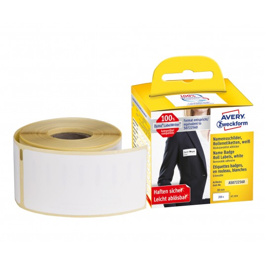 • Identyfikatory imienne Avery Zweckform w rolce do drukarek termicznych • Są w 100% kompatybilne z: Dymo LW310; Dymo LW330T, LW400 Seria, LW450 Seria; Brother TD-4100N • Rozmiar: 41 x 89 mm • Klej: usuwalny • 1 rolka/op. • 200 etykiet/rolka • Kolor: białe • Praktyczne i ekonomiczne rozwiązanie na spotkania i konferencje firmowe • Wykonane z elastycznego materiału - pewnie przylegają do ubrań i dają się łatwo usunąć nie pozostawiając śladów
