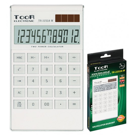 – wyświetlacz 12-pozycyjny – klawisz cofania ostatniej cyfry – kasowanie ostatniej pozycji – całkowite kasowanie rejestrów i pamięci – obliczanie procentu – obliczanie pierwiastka – pamięć – klawisz podwójnego zera – zasilanie bateryjne i słoneczne – uchylna podstawka – zgodny z wymaganiami Unii Europejskiej – rozmiar: 183 x 107 x 16 mm – dożywotnia gwarancja – instrukcja obsługi