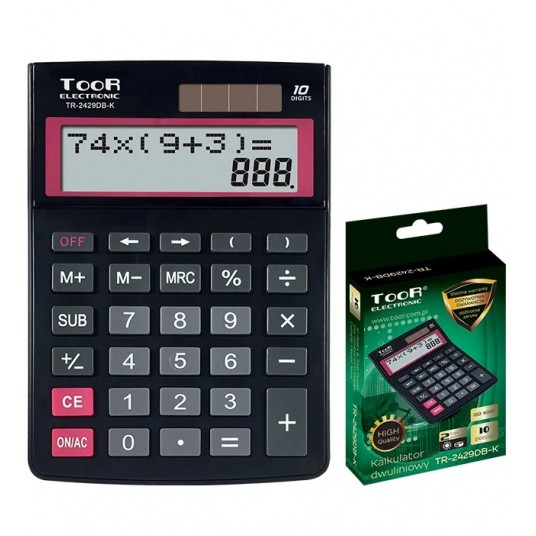 – dwuliniowy wyświetlacz – 10-pozycyjny – kasowanie ostatniej pozycji – klawisze przechodzenia pomiędzy cyframi – wykonywanie działań w nawiasach – obliczanie procentu – pamięć – klawisz zmiany znaku – zasilanie bateryjne i słoneczne – rozmiar: 145 x 105 x 33 mm – zgodny z wymaganiami Unii Europejskiej – dożywotnia gwarancja – instrukcja obsługi