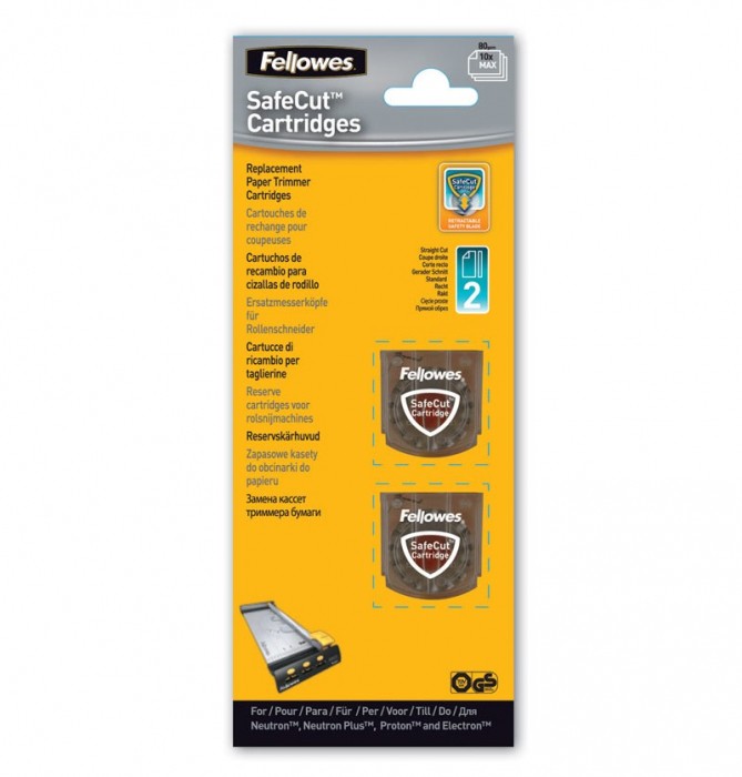 Fellowes SafeCut™ do trymerów zapewniają możliwość wymiany zużytych ostrzy na nowe lub dokupienie dodatkowych. W zestawie 2 kasety z ostrzami do cięcia prostego. Każde ostrze jest zamknięte w kasecie SafeCut™, co oznacza, że jest odsłonięte tylko podczas użytkowania. Dedykowane do trymerów Fellowes: Neutron A4, Neutron A4 Plus, Proton A4, Proton A3 oraz Electron A4 i Electron A3.