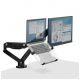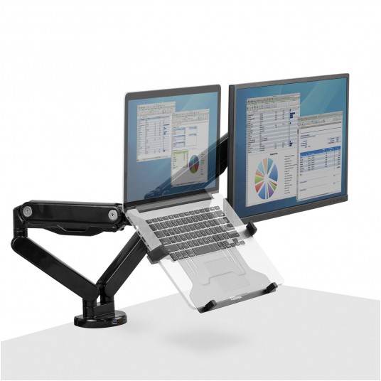 Zapewnia możliwość regulacji w celu podniesienia laptopa lub korzystania z monitora i laptopa. Na ramieniu z dwoma monitorami zapewnia łatwą regulację położenia platformy. Wyposażona w otwory zapobiegające przegrzaniu laptopa. Zgodność ze standardem VESA 75x75 oraz 100x100. Przekątna ekranu od 10" do 17". Maksymalna waga obciążenia 4,5 kg. Gwarancja 1 rok.