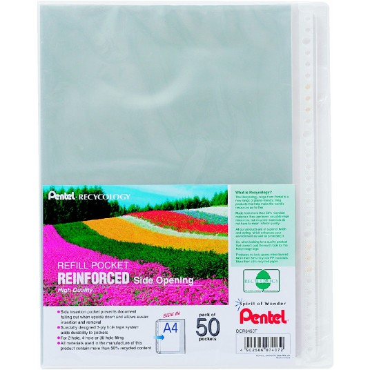 Koszulka na dokumenty posiadająca system bocznego otwierania. 3-warstwowa taśma zwiększa trwałość. Wykonana w ponad 50% z materiałów przetworzonych.