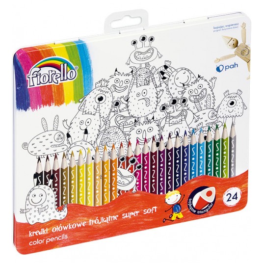 – ostrzone – przekrój trójkątny – długość 17,8 cm – lakierowane – bardzo miękki grafit – intensywne kolory – praktyczne opakowanie – po otwarciu wygodny dostęp do kredek – każda kredka posiada nadruk i lakierowaną końcówkę – zgodne z wymaganiami Unii Europejskiej – średnica grafitu 3 mm – 24 kolory w metalowym opakowaniu