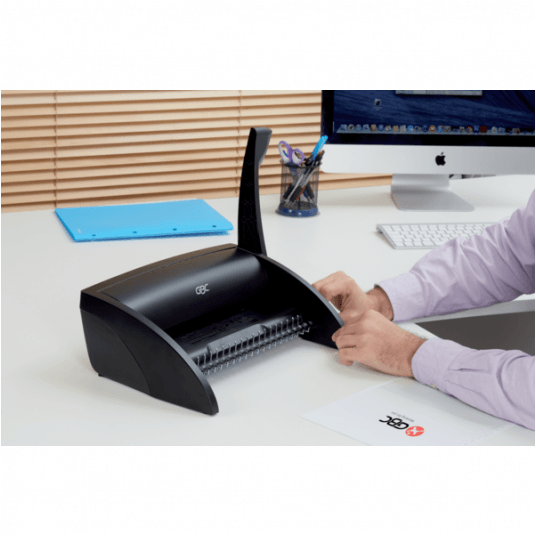 Bindowanie nie może być prostsze! Bindownica GBC CombBind® C100 idealnie nadaje się do użytku osobistego i bindowania w małych nakładach. Urządzenie - wyposażone w ręczny dziurkacz - umożliwia przedziurkowanie jednorazowo do 9 kartek o gramaturze 80 g/m2 oraz bindowanie do 160 kartek A4 w spiralę o średnicy 19 mm. Nadaje się do użytku w każdym miejscu i o każdej porze - lekka, niewielkich rozmiarów, łatwa do przechowywania, gdy nie jest potrzebna.