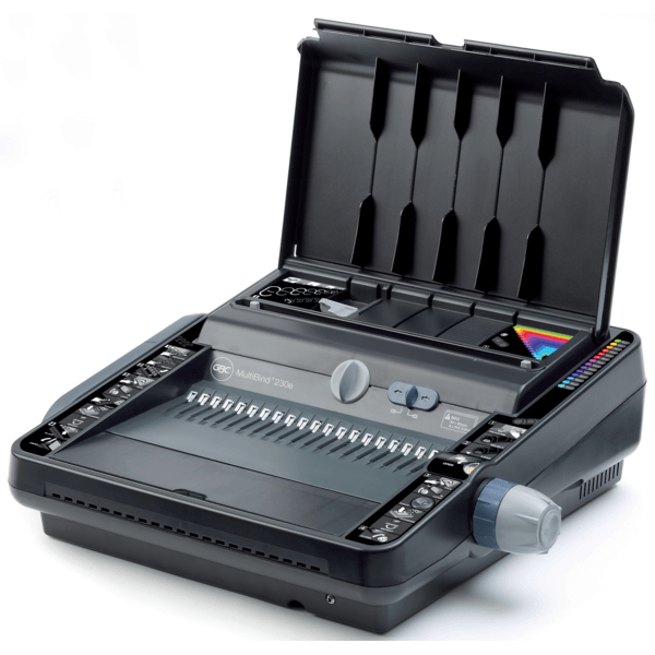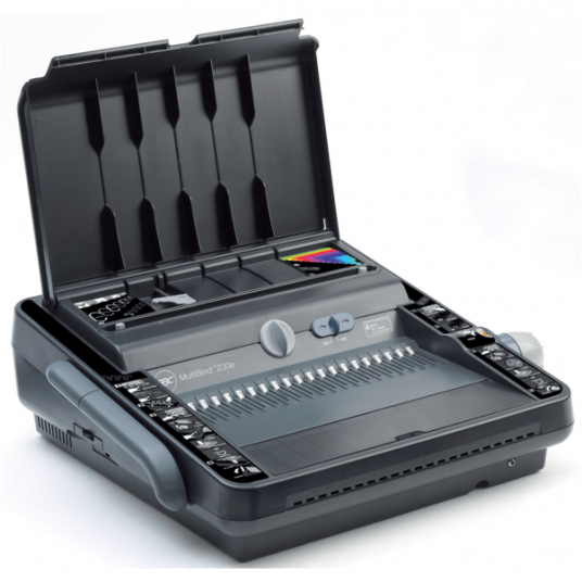 Bindownica MultiBind 230E - idealna do codziennej oprawy w grzbiety plastikowe lub druciane - wyposażona jest w system Flowline Pro Binding umożliwiający rozdzielanie dokumentów i ich automatyczne centrowanie, montowany w standardzie. Model ten sprawia, że proces bindowania jest prosty i zapewnia każdorazowo znakomite rezultaty. Dziurkuje do 30 kartek o gramaturze 80 g/m2 jednocześnie i binduje do 140 lub 450 kartek, w zależności od użytych grzbietów.
