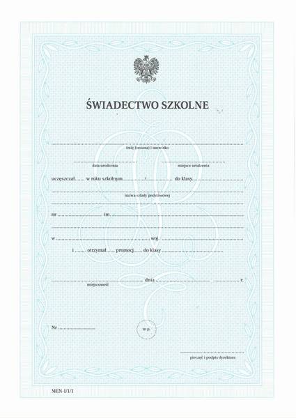 MEN I/1/1 Świadectwo dla uczniów klas I-III szkoły