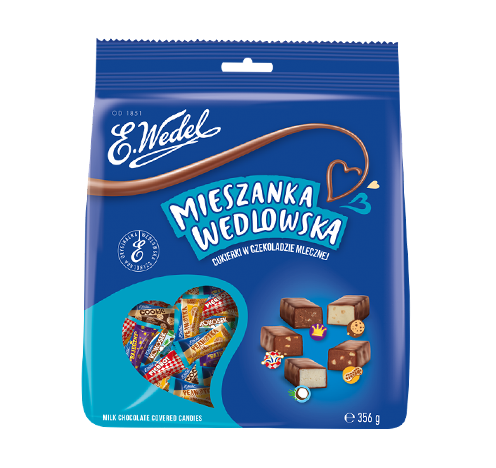 cukier, tłuszcze roślinne (palmowe), czekolada deserowa 19% (cukier, miazga kakaowa, tłuszcz kakaowy, tłuszcz mleczny, emulgatory: lecytyna sojowa i E476, aromat), mleko pełne w proszku, serwatka w proszku (z mleka), miazga z orzeszków arachidowych, listki waflowe (mąka pszenna, mąka żytnia, olej słonecznikowy, jaja w proszku, maltodekstryna, substancje spulchniające: wodorowęglan sodu, wodorowęglan amonu, pirosiarczyn sodu, emulgator: lecytyna sojowa, sól), kakao o obniżonej zawartości tłuszczu, orzeszki arachidowe (kawałki), płatki karmelowe (cukier, syrop glukozowy), karmelizowane ziarno kakaowe (ziarno kakaowe, cukier), pasta kawowa (kawa, tłuszcz roślinny rzepakowy, emulgator: lecytyna sojowa), chrupki zbożowe (mąka pszenna, cukier, słód pszenny, substancja spulchniająca: wodorowęglan sodu, emulgator: lecytyna słonecznikowa, sól, aromat), miazga kakaowa, aromaty, emulgator (lecytyna sojowa), tłuszcz kakaowy, barwnik (ekstrakt z papryki), tłuszcz mleczny, sól, Czekolada deserowa: masa kakaowa minimum 47%.