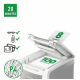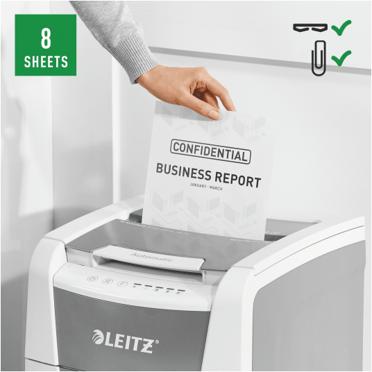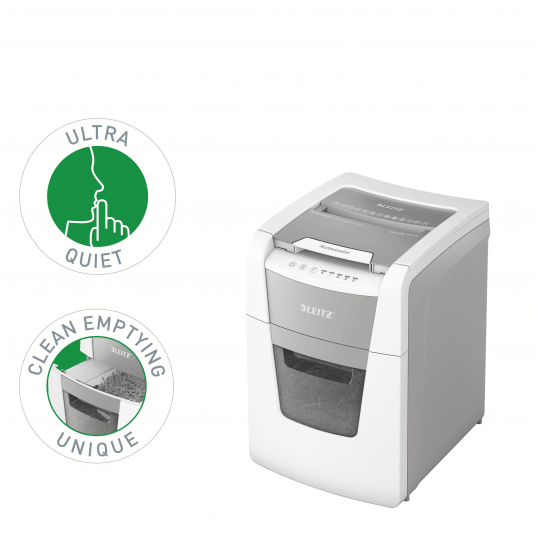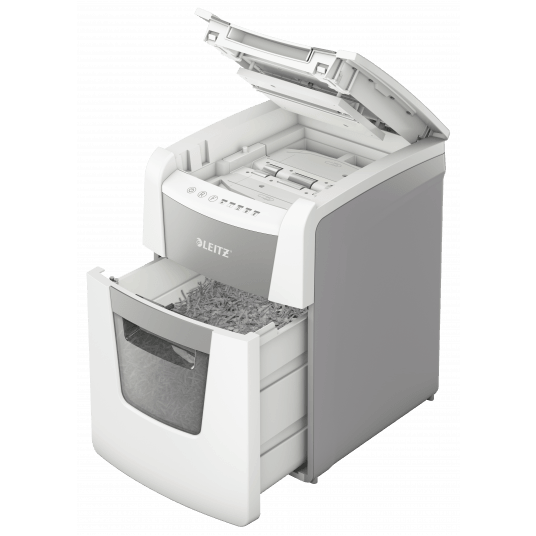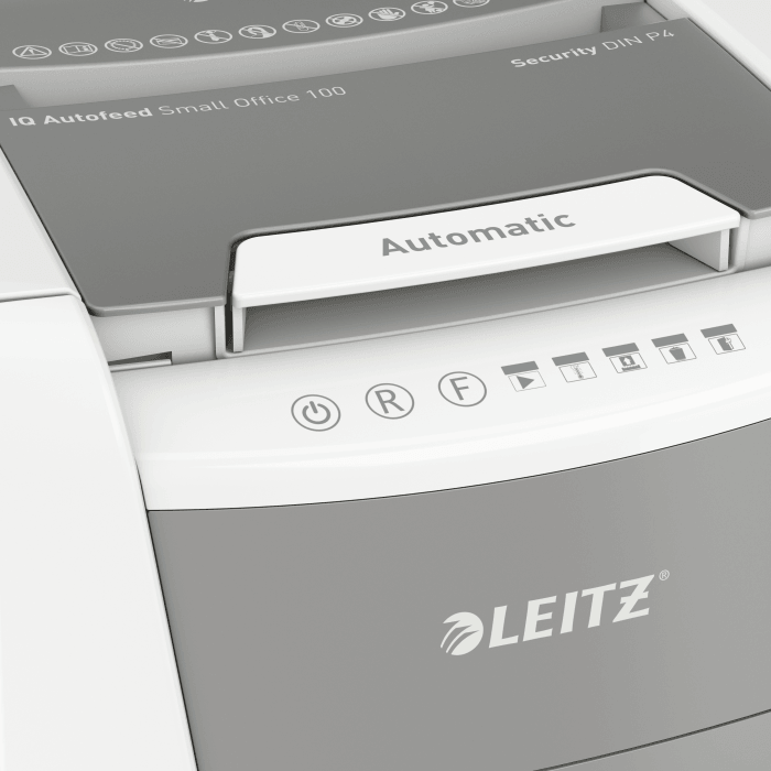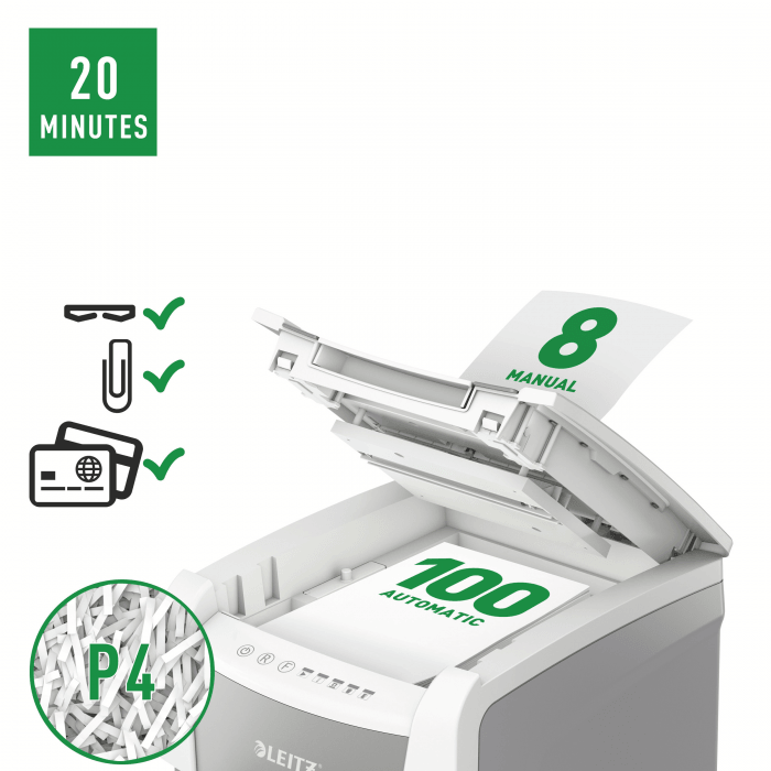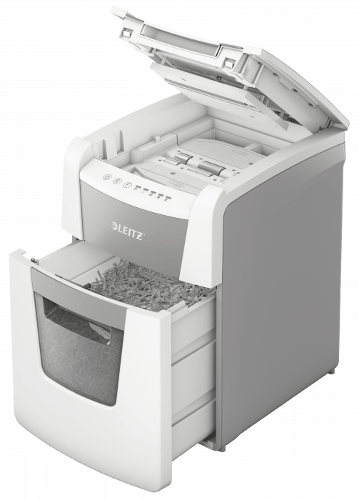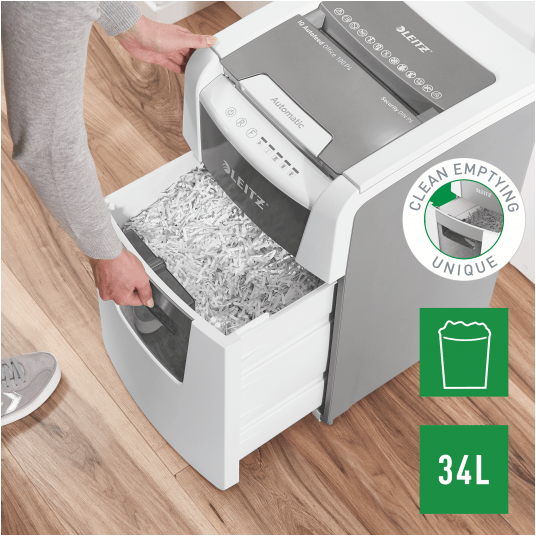 Niszczy do 100 kartek A4 jednocześnie- przeznaczona jest do sporadycznego użytkowania w domowym biurze. Technologia zapobiegania zacięciom-urządzenie zatrzymuje się automatycznie i cofa papier, jeżeli w podajniku umieszczono zbyt wiele arkuszy. Pracuję przez 20 minut bez przerwy. Stopień bezpieczeństwa P4, konfetti (4 x 28 mm). Lampka LED sygnalizuje , gdy urządzenie musi przerwać pracę w celu schłodzenia. Prędkość niszczenia : 1,8 m na minutę; Dotykowy panel sterowania - łatwa, intuicyjna obsługa urządzenia; Łatwy do opróżniania 34-litrowy pojemnik. Blokada bezpieczeństwa- zabezpiecza przed używaniem niszczarki bez nadzoru, Niszczy także zszywki i spinacze; 2 lata + 1 rok gwarancji- zarejestruj urządzenie, aby przedłużyć gwarancję o rok, wymiary: 365 x 530 x 430 mm