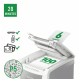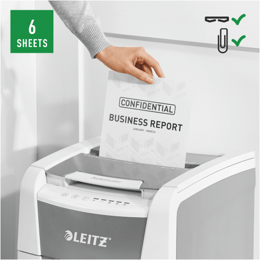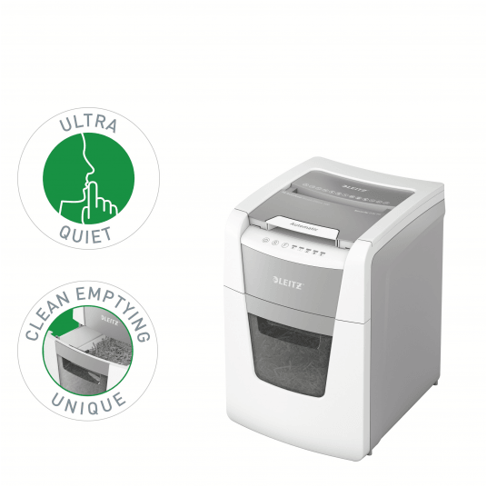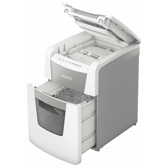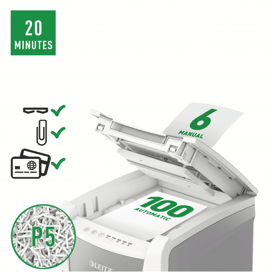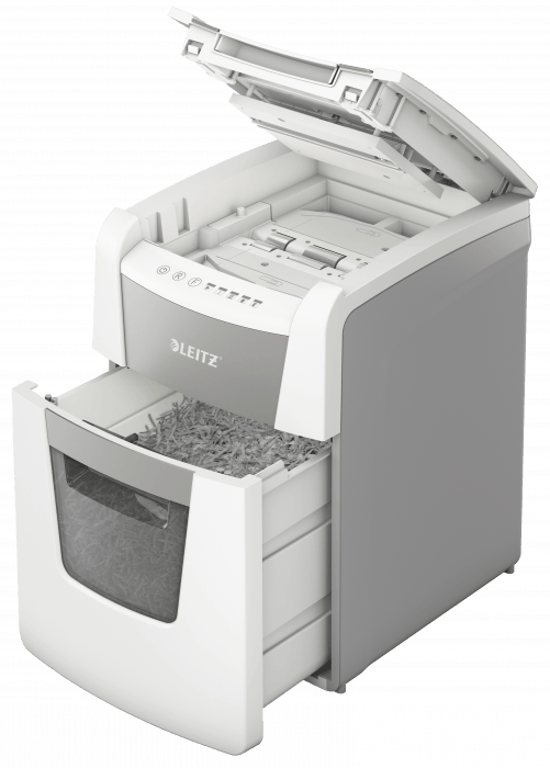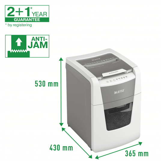 Niszczy do 100 kartek A4 jednocześnie- przeznaczona jest do sporadycznego użytkowania w domowym biurze. Technologia zapobiegania zacięciom-urządzenie zatrzymuje się automatycznie i cofa papier, jeżeli w podajniku umieszczono zbyt wiele arkuszy. Pracuję przez 20 minut bez przerwy. Stopień bezpieczeństwa P4, konfetti (4 x 28 mm). Lampka LED sygnalizuje , gdy urządzenie musi przerwać pracę w celu schłodzenia. Prędkość niszczenia : 1,8 m na minutę; Dotykowy panel sterowania - łatwa, intuicyjna obsługa urządzenia; Łatwy do opróżniania 34-litrowy pojemnik. Blokada bezpieczeństwa- zabezpiecza przed używaniem niszczarki bez nadzoru, Niszczy także zszywki i spinacze; 2 lata + 1 rok gwarancji- zarejestruj urządzenie, aby przedłużyć gwarancję o rok, wymiary: 365 x 530 x 430 mm