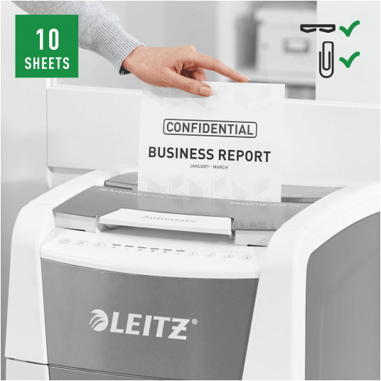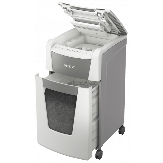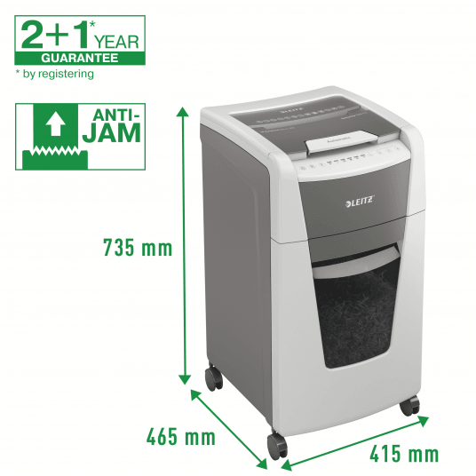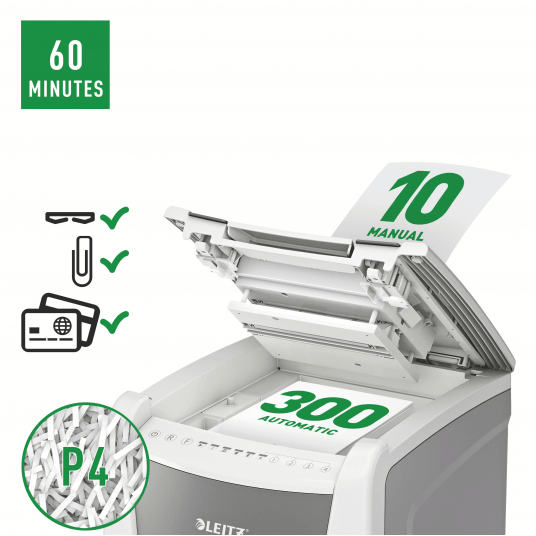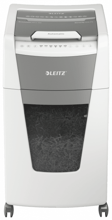 Niszczy do 300 kartek A4 jednocześnie- przeznaczona jest do sporadycznego użytkowania w domowym biurze. Technologia zapobiegania zacięciom-urządzenie zatrzymuje się automatycznie i cofa papier, jeżeli w podajniku umieszczono zbyt wiele arkuszy. Może pracować przez 60 minut bez przerwy. Stopień bezpieczeństwa P-4, konfetti (4 x 28 mm), blokada na PIN. Lampka LED sygnalizuje , gdy urządzenie musi przerwać pracę w celu schłodzenia . Prędkość niszczenia : 1,8 m na minutę; Dotykowy panel sterowania - łatwa, intuicyjna obsługa urządzenia; Łatwy do opróżniania 60-litrowy pojemnik. Blokada bezpieczeństwa- zabezpiecza przed używaniem niszczarki bez nadzoru, Niszczy także zszywki i spinacze; 2 lata + 1 rok gwarancji- zarejestruj urządzenie, aby przedłużyć gwarancję o rok, wymiary: 415 x 735x 465 mm