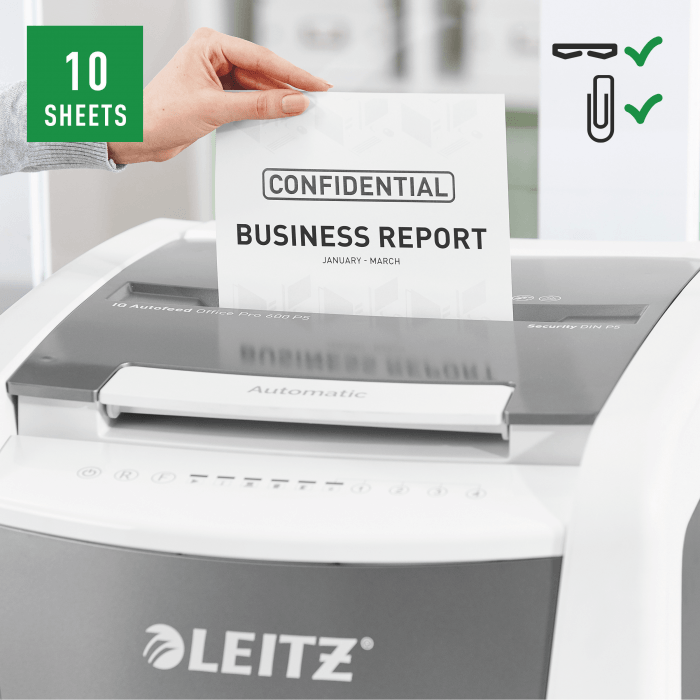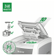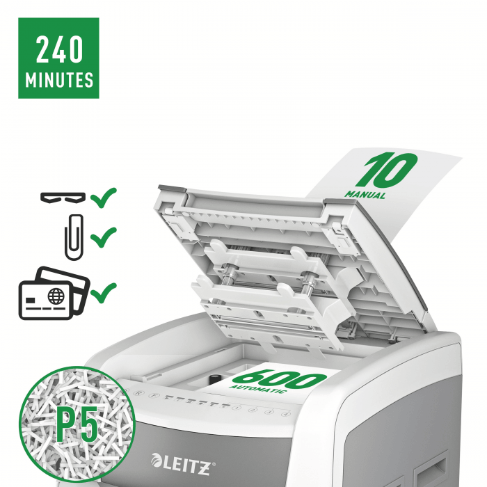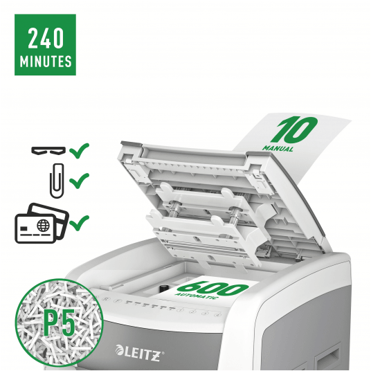 Niszczy do 600 kartek A4 jednocześnie- przeznaczona jest do sporadycznego użytkowania w domowym biurze. Technologia zapobiegania zacięciom-urządzenie zatrzymuje się automatycznie i cofa papier, jeżeli w podajniku umieszczono zbyt wiele arkuszy. Może pracować przez 240 minut bez przerwy. Stopień bezpieczeństwa P-5, mikrościnki (2 x 15 mm), blokada na PIN. Lampka LED sygnalizuje , gdy urządzenie musi przerwać pracę w celu schłodzenia . Prędkość niszczenia : 1,8 m na minutę; Dotykowy panel sterowania - łatwa, intuicyjna obsługa urządzenia; Łatwy do opróżniania 110-litrowy pojemnik. Blokada bezpieczeństwa- zabezpiecza przed używaniem niszczarki bez nadzoru, Niszczy także zszywki i spinacze; 2 lata + 1 rok gwarancji- zarejestruj urządzenie, aby przedłużyć gwarancję o rok, wymiary: 510 x 960 x 570 mm