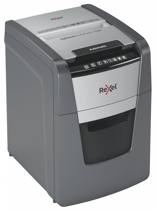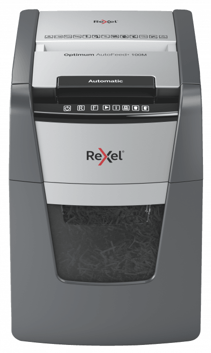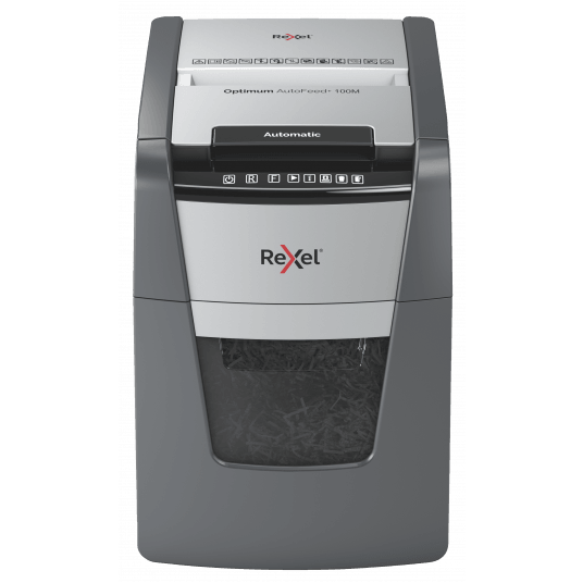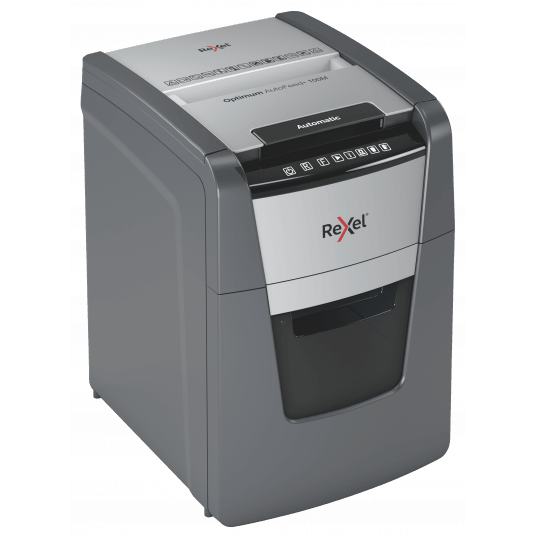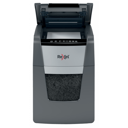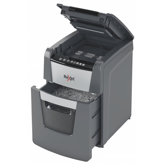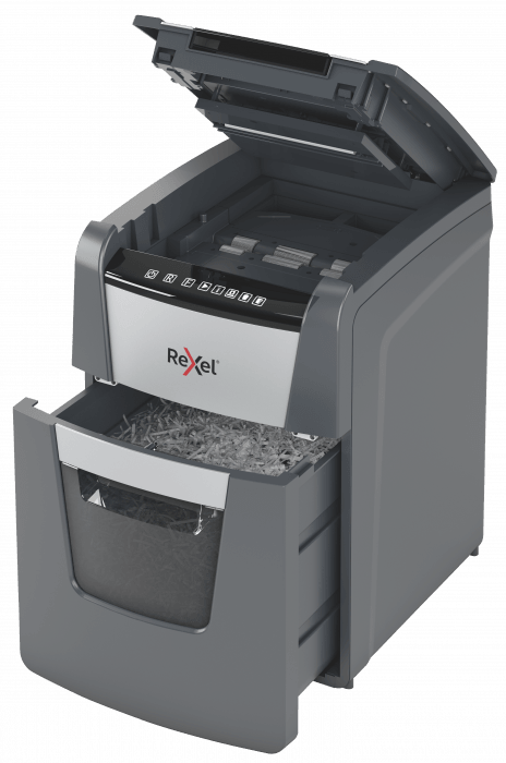 Oszczędność 98% czasu. Podajnik automatyczny AutoFeed zapewnia łatwą i oszczędną czasowo obsługę niszczarki - zaoszczędzisz 98% czasu w porównaniu do niszczczarek z podajnikiem ręcznym. Technologia zapobiega zacięciom. Niszczy także karty kredytowe, zszywki i spinacze. Dotykowy panel sterowania. Czujnik na podczerwień informuje o wypełnieniu pojemnika na ścinki. Ultraniski poziom hałasu: 55 dBA. - mikrościnki (2x15 mm) - czas nieprzerwanej pracy 20 minut - kosz na ścinki 34 l - gwarancja 2 lata