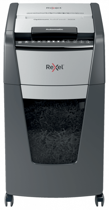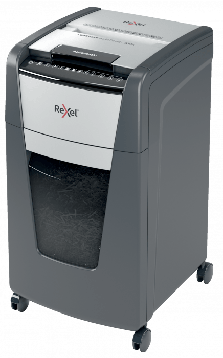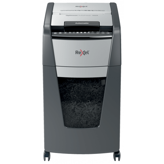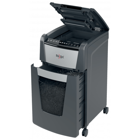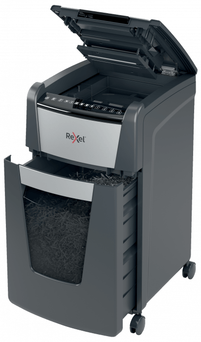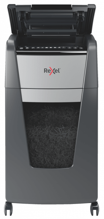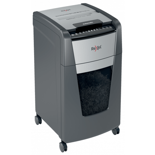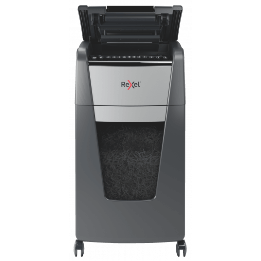 Oszczędność 98% czasu. Podajnik automatyczny AutoFeed zapewnia łatwą i oszczędną czasowo obsługę niszczarki - zaoszczędzisz 98% czasu w porównaniu do niszczczarek z podajnikiem ręcznym. Technologia zapobiega zacięciom. Niszczy także karty kredytowe, zszywki i spinacze. Dotykowy panel sterowania. Czujnik na podczerwień informuje o wypełnieniu pojemnika na ścinki. Ultraniski poziom hałasu: 55 dBA. - konfetti (4x26mm) - czas nieprzerwanej pracy 60 minut - kosz na ścinki 60 l - gwarancja 2 lata