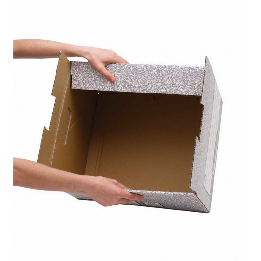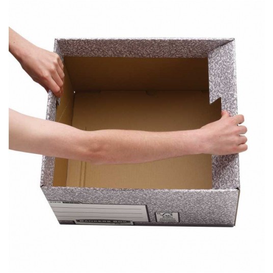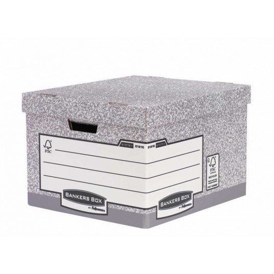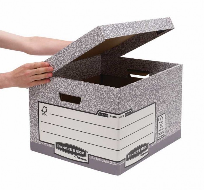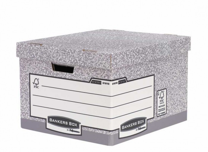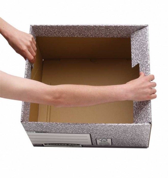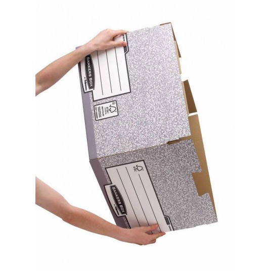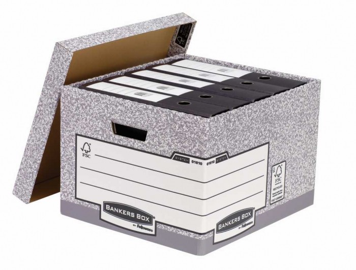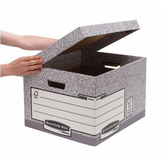 Pudło ze zdejmowanym wiekiem Bankers Box to wytrzymałe i praktyczne pudło umożliwiające przechowywanie dokumentów w pudełkach na akta lub segregatorach. Podwójna konstrukcja ścian bocznych i dna zwiększa nośność. Wyposażone w wygodne uchwyty do przenoszenia. Łatwe do złożenia: konstrukcja z systemem FastFold® umożliwia złożenie pudła w zaledwie kilka sekund. Z czytelnym oznakowaniem: dużą, czytelną etykietą do opisu zawartości na grzbietach pudełka. Wykonane z tektury z certyfikatem FSC pochodzącej w 100% z odzysku. Opakowanie zawiera 10 sztuk pudeł.