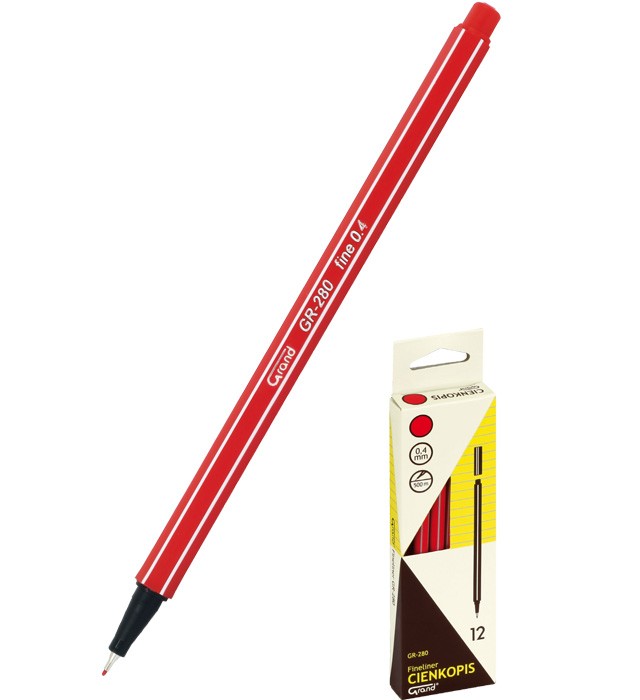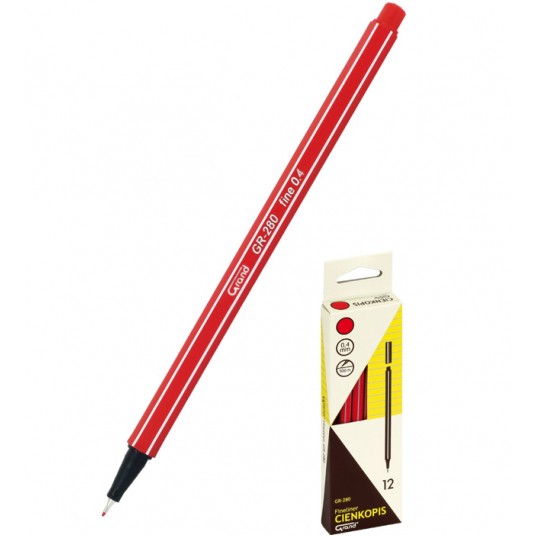 – końcówka fibrowa oprawiona w metal – tusz na bazie wody – długość pisania: 500 m – grubość linii 0,4 mm – czerwony kolor tuszu – opakowanie zawiera 12 sztuk